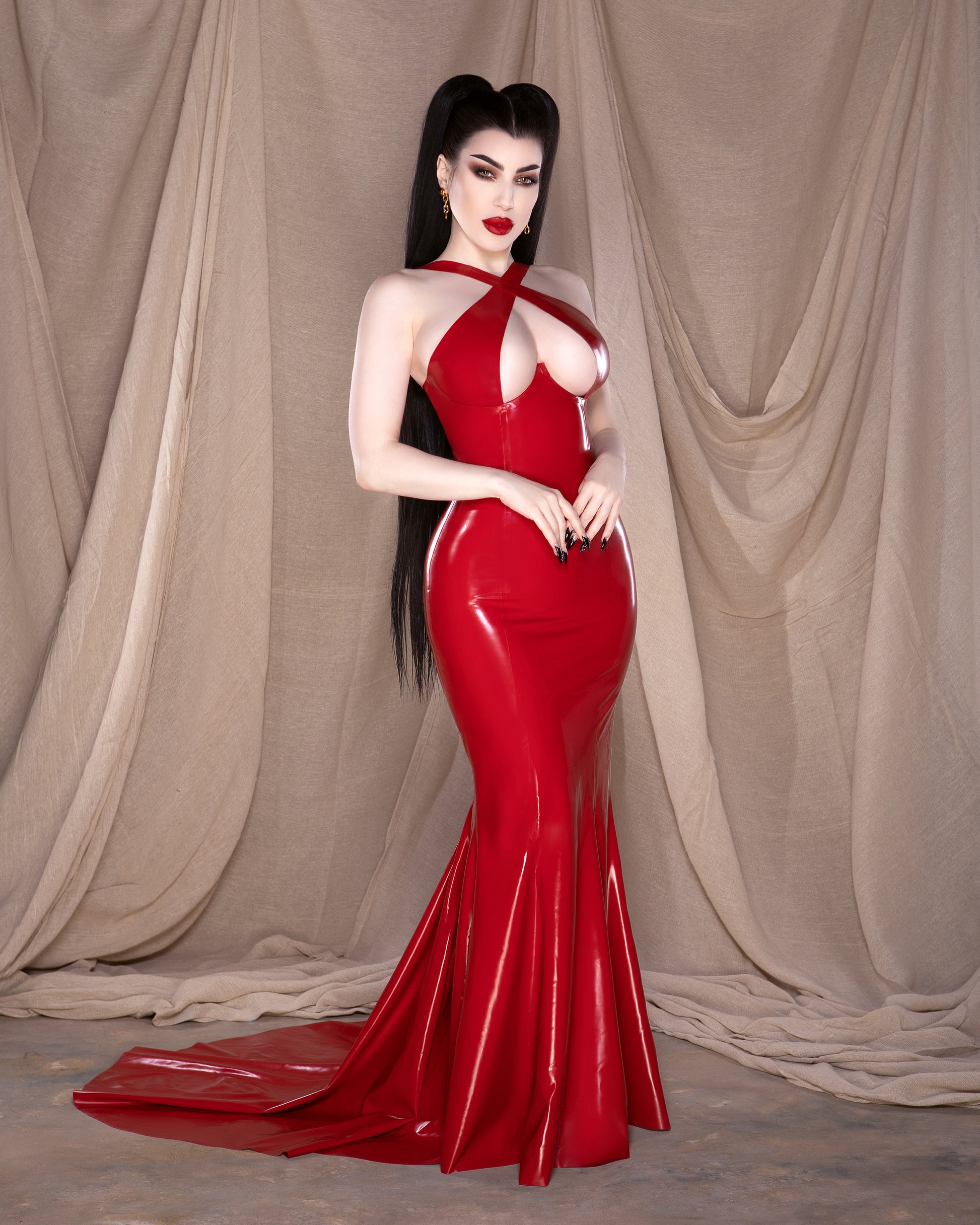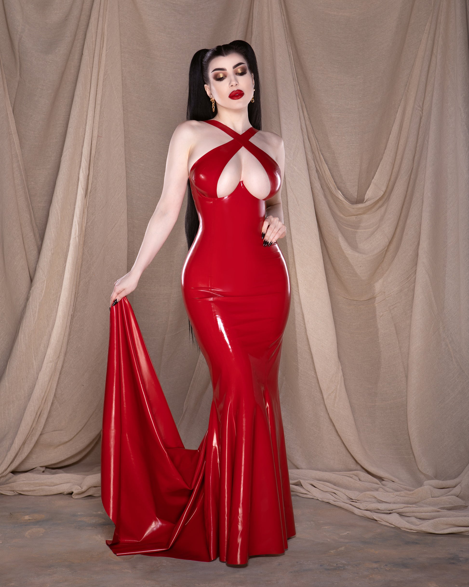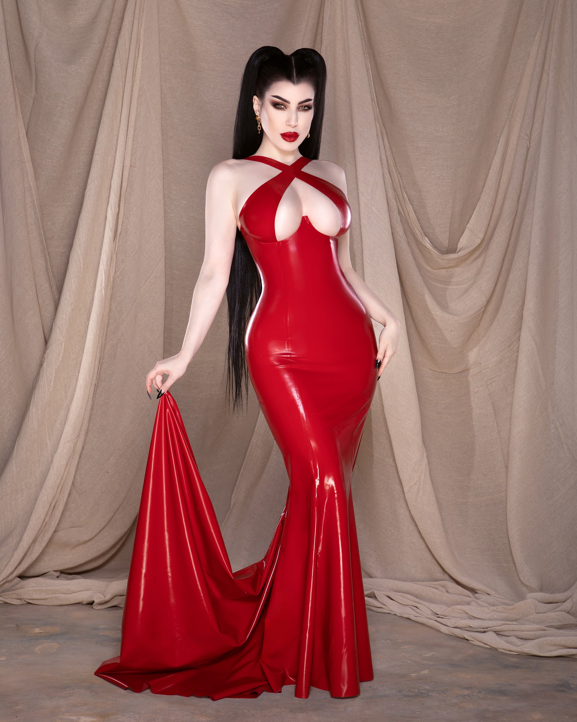 Experience our alluring signature crossover cup design, now transformed into a captivating floor-length gown that exudes luxury. She is complete with a show-stopping full train and, if desired, a convenient wrist loop for added flair. She truly takes latex to levels never seen before. Yes, latex can be sultry, deserving its place in fashion and on the red carpet.