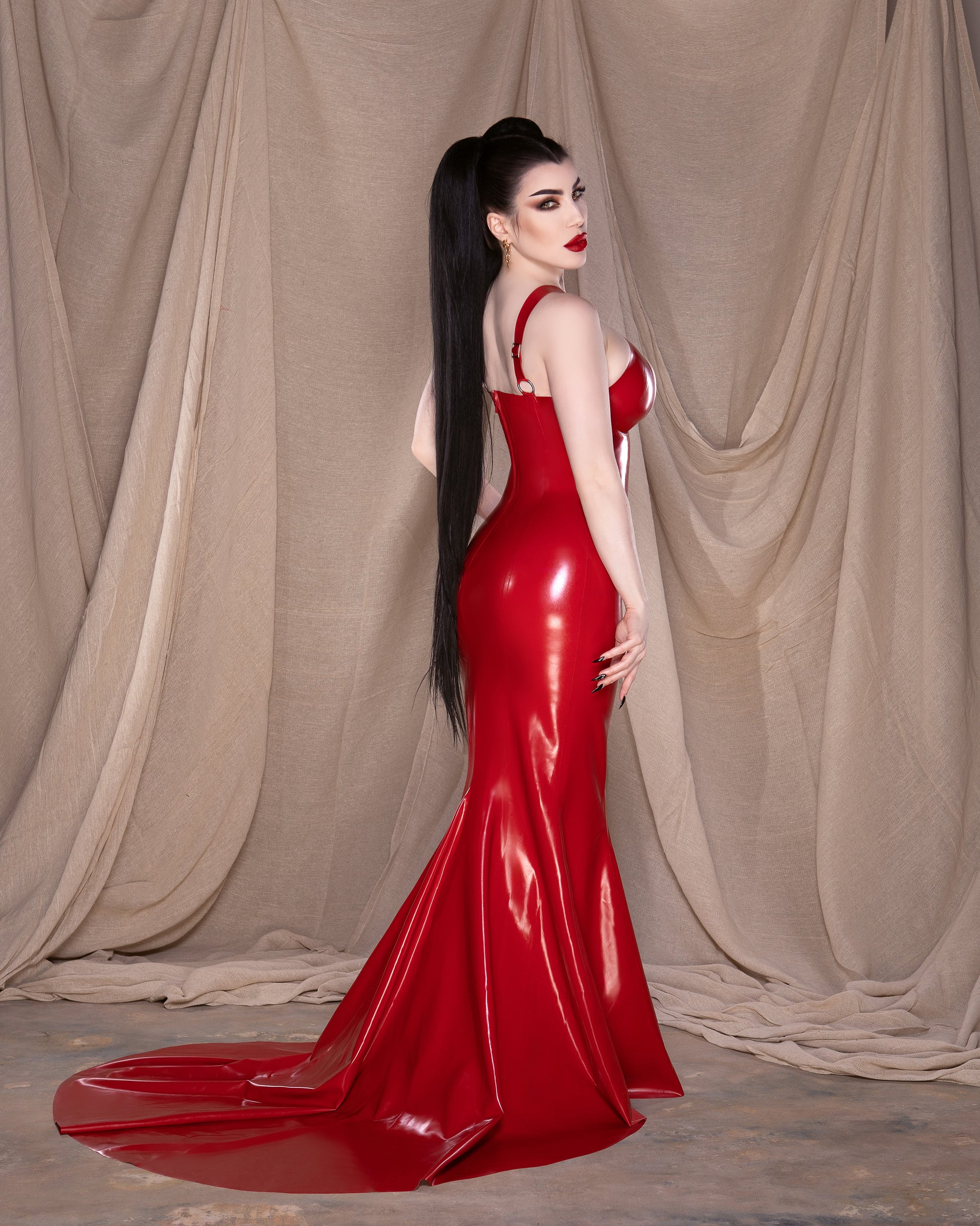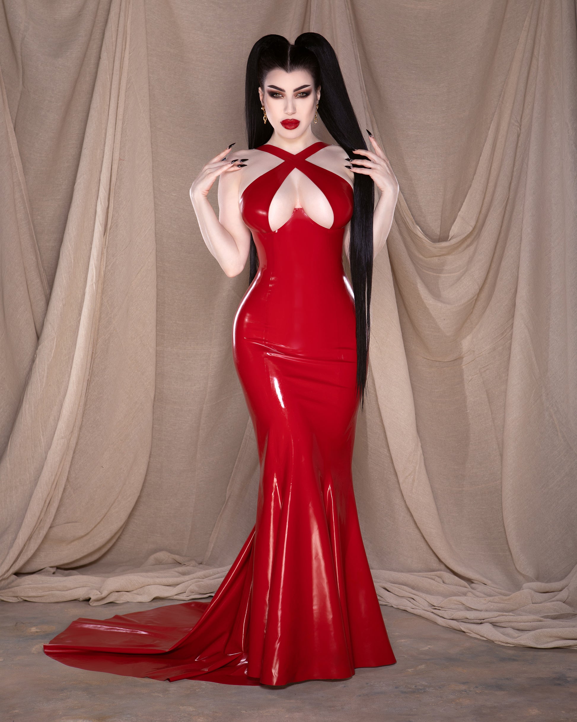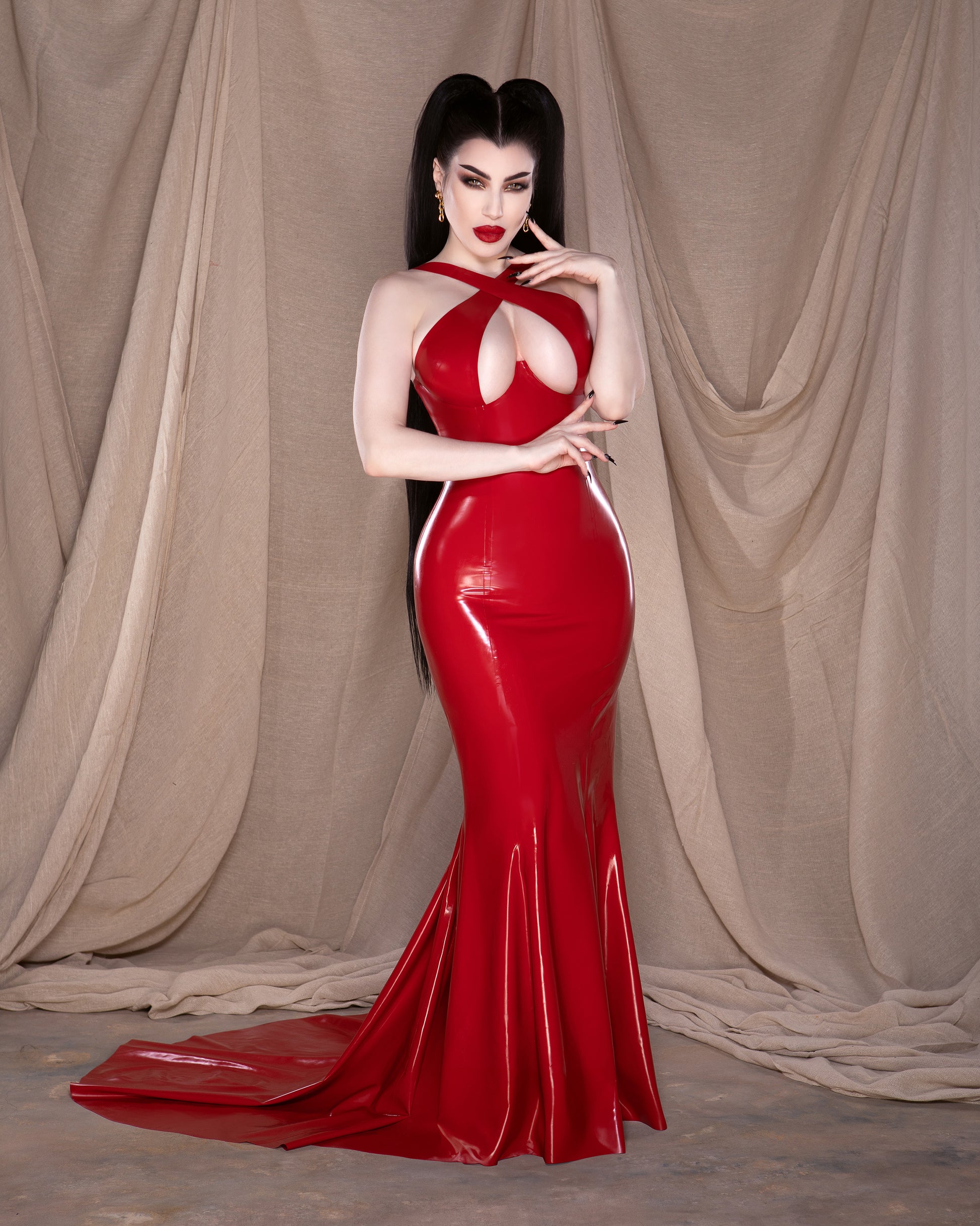 Experience our alluring signature crossover cup design, now transformed into a captivating floor-length gown that exudes luxury. She is complete with a show-stopping full train and, if desired, a convenient wrist loop for added flair. She truly takes latex to levels never seen before. Yes, latex can be sultry, deserving its place in fashion and on the red carpet.