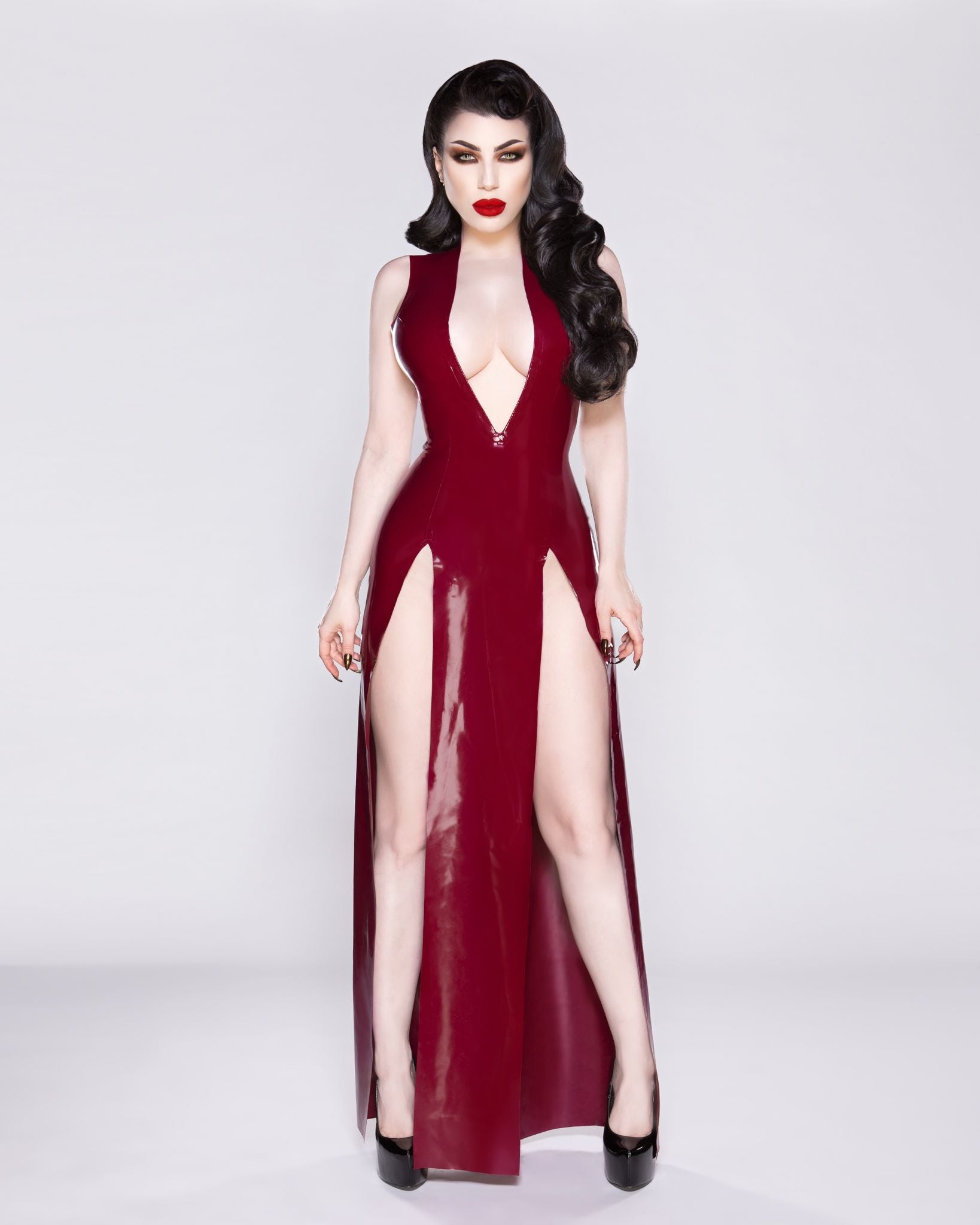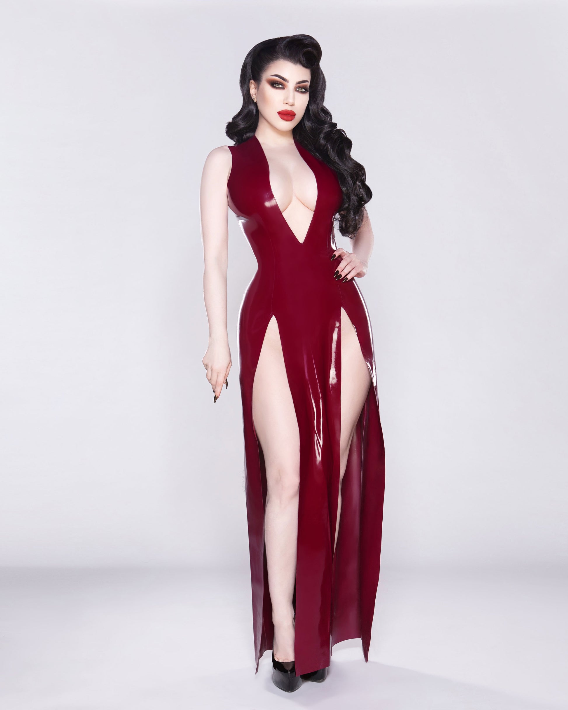 This stunning floor length latex gown features a deep V with two high side splits. The dress is customisable to your measurements and desired length and is 42 inches to the floor from the waist as standard (different lengths may vary in price). Choose from one or two side splits, or none if you wish. Comes with two as standard.