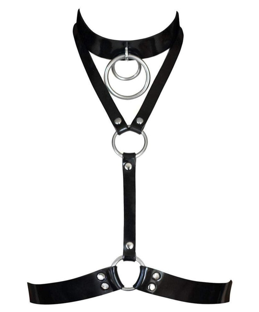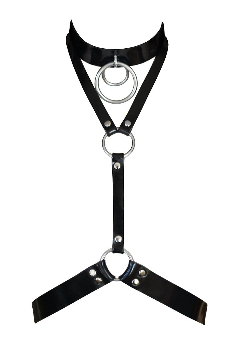 The 'Imperium' harness is handcrafted of extra thick latex and features steel o-rings. The harness fastens at the back with buckles.