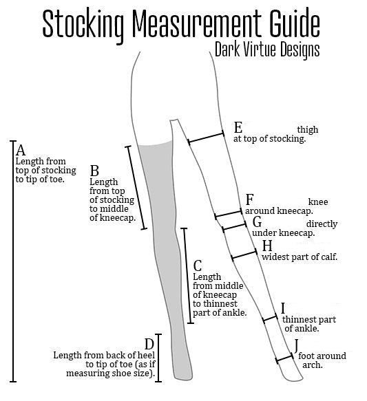 We will need your shoe size, the length you desire the stocking to be from the ground (when stood flat), and the circumference of your leg at various points. Please see the chart in the images for the measurements required for made to measure.